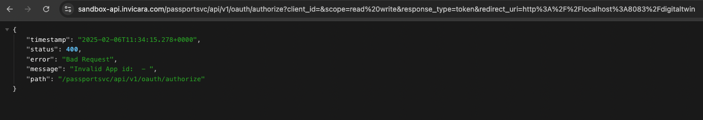 When trying to connect to the DigitalTwin app via localhost, you may encounter into the above error. Please ensure you use the correct URL address, which is: http://localhost:8083/digitaltwin/.